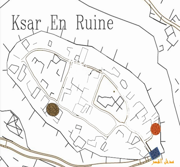 la seule entrée du ksar qui se situe du coté sud camouflée pour des raisons de sécurité. Il s’agit d’un passage abrité ayant, d’origine, une porte en bois qui ferme à clef. On y trouve des bancs en bois de deux cotés pour s’asseoir et pour les assemblées ayants-droits. A gauche de l’entrée plus en haut se trouve la case du Gardien.