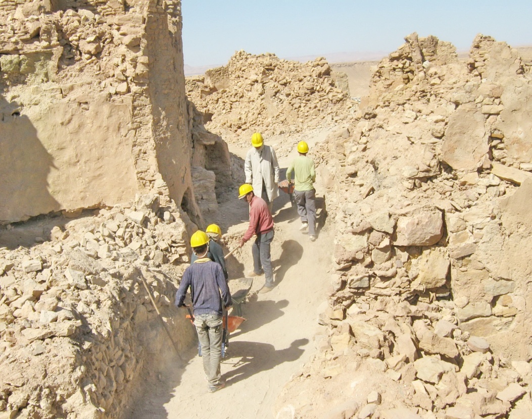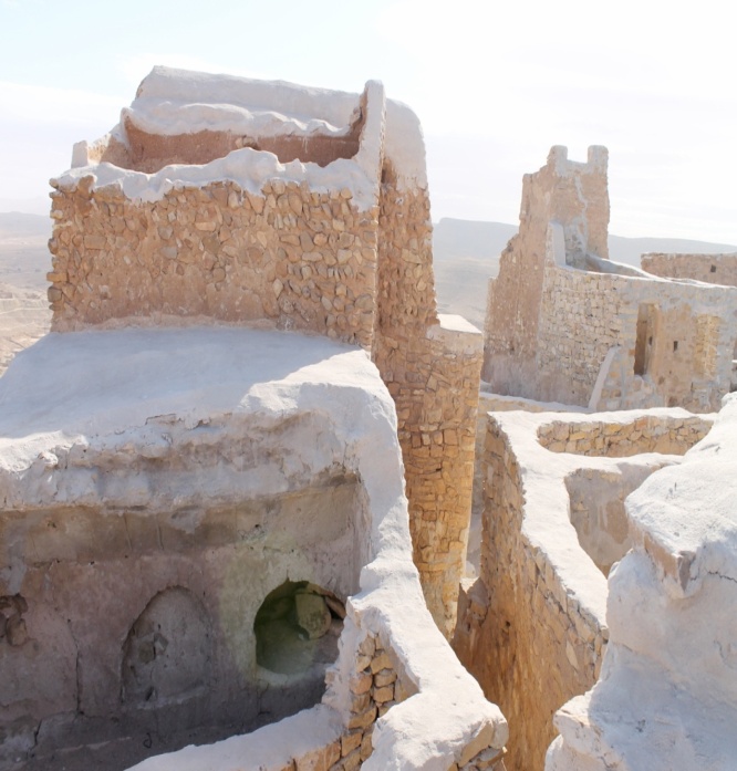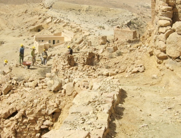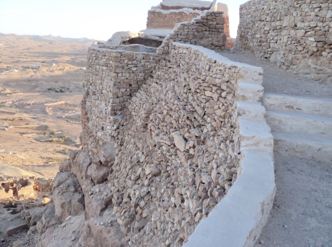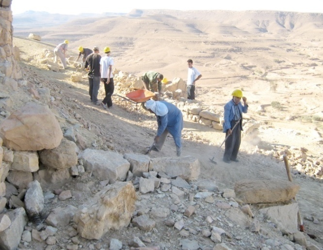 - Nettoyage des ghorfas du Gasr, tri des moellons utiles et dégagement des remblais.