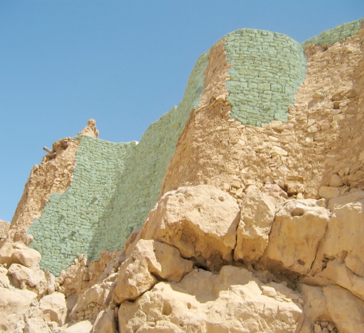 - Consolidation des parties endommagées avec des échafaudages et traitement des fissures avec le mortier de plâtre traditionnel et de petites pierres.